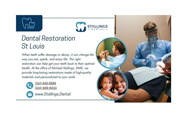 Maintaining a healthy smile goes beyond aesthetics—it's an investment in your overall well-being. For residents of St. Louis, Stallings Dental stands out as a premier destination for dental care. With years of expertise and a patient-centered approach, they offer a wide array of services, including state-of-the-art Dental Restoration and thorough Dental Cleaning.Dental Restoration St. LouisLife can take a toll on your teeth, whether through cavities, injuries, or wear and tear. Stallings Dental specializes in modern restoration techniques designed to bring back the function and beauty of your smile. From dental crowns and bridges to implants and veneers, their skilled team uses cutting-edge materials and methods to ensure long-lasting results. Whether you need minor repairs or extensive reconstruction, Stallings Dental creates customized treatment plans tailored to your needs.Dental Cleaning St. LouisRoutine dental cleaning is essential for preventing gum disease, cavities, and other oral health issues. At Stallings Dental, their hygienists are dedicated to providing thorough yet gentle cleanings. They remove plaque, tartar, and stains, leaving your teeth sparkling and your gums healthy. Regular cleanings also offer an opportunity to detect potential problems early, saving you time, discomfort, and expense in the future.What sets Stallings Dental apart is their commitment to patient comfort and education. The friendly staff takes the time to explain procedures, answer questions, and ensure every visit is a positive experience. Their modern facility is equipped with advanced technology to deliver efficient and precise care in a welcoming environment.Whether you're looking to restore your smile's brilliance or maintain your oral health, Stallings Dental is here to help. Schedule your appointment today to experience expert care and personalized service in St. Louis. Discover the difference with Stallings Dental, where your smile is their priority.