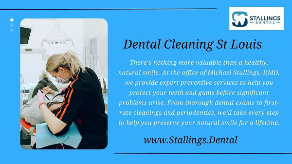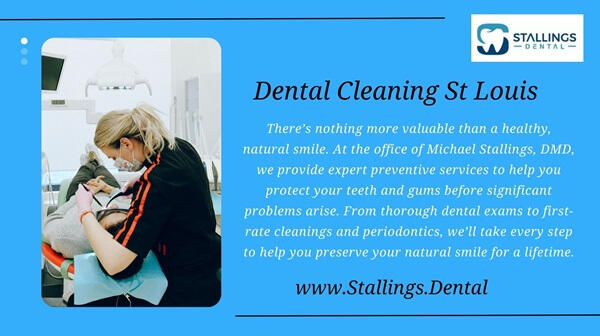 Stallings Dental is your trusted partner in achieving optimal oral health and a confident smile in St. Louis, MO. Our comprehensive services, including dental implants and dental cleaning, are designed to meet the unique needs of each patient.Dental Implants:Are you missing a tooth or dealing with uncomfortable dentures? Stallings Dental offers state-of-the-art dental implant solutions to restore your smile's functionality and aesthetics. Dental implants St Louis MO are permanent fixtures that mimic the natural look and feel of your teeth. Our skilled team utilizes advanced technology and precise techniques to ensure a seamless integration of the implant into your jawbone. Whether you need a single tooth replacement or a full set of implants, Stallings Dental is committed to providing personalized care for lasting results.Dental Cleaning:Maintaining a healthy smile starts with regular dental cleanings. Stallings Dental in St. Louis, MO, offers professional and thorough dental cleaning St Louis services to keep your teeth and gums in optimal condition. Our experienced hygienists use the latest tools and techniques to remove plaque, tartar, and surface stains, preventing the development of cavities and gum disease. Regular cleanings at Stallings Dental not only contribute to a dazzling smile but also support your overall well-being by reducing the risk of systemic health issues linked to oral health.At Stallings Dental, patient comfort and satisfaction are our top priorities. Our welcoming atmosphere and friendly staff ensure a positive dental experience for every visit. We take the time to educate our patients about their oral health, empowering them to make informed decisions for long-lasting results.Unlock the potential of your smile with Stallings Dental in St. Louis, MO. Whether you're considering dental implants or in need of a professional cleaning, trust our skilled team to deliver exceptional care. Schedule your appointment today and embark on a journey to a healthier, more confident you.