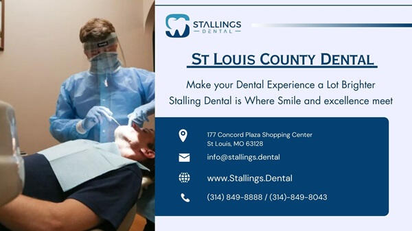 Stallings Dental is a premier dental practice located in St. Louis County, renowned for its comprehensive dental services and patient-centered approach. With a dedicated team of highly trained professionals, Stallings Dental provides a wide range of dental care solutions, ensuring that residents of St. Louis County have access to top-tier oral health services.St. Louis County Dental CareStallings Dental prides itself on offering an extensive array of general and cosmetic dental services tailored to meet the unique needs of each patient. Whether you're seeking routine check-ups, cleanings, fillings, or more advanced procedures such as crowns, bridges, and implants, Stallings Dental has you covered. The practice uses the latest dental technologies and techniques to ensure optimal results and patient comfort.One of the key features that sets Stallings Dental apart in St. Louis County is its commitment to preventative care. Regular dental visits are essential for maintaining oral health, and the team at Stallings Dental works diligently to educate patients on the best practices for dental hygiene. Through thorough examinations and personalized care plans, Stallings Dental helps prevent common dental issues and promotes long-term oral health.St. Louis Emergency Dental ServicesDental emergencies can happen at any time, and Stallings Dental is equipped to handle these urgent situations with prompt and effective care. Recognizing the importance of immediate attention in cases of severe pain, broken teeth, or other dental traumas, Stallings Dental offers emergency dental services to the St. Louis community. Their responsive and compassionate team is available to provide quick relief and necessary treatments to address dental emergencies, ensuring patients receive the care they need without delay.In times of dental crisis, Stallings Dental stands out as a reliable and trustworthy option for St. Louis emergency dental care. Their facility is designed to accommodate urgent dental needs, with skilled professionals ready to diagnose and treat a variety of emergency conditions. Patients can have peace of mind knowing that expert help is just a call away, providing swift and effective solutions to alleviate pain and restore dental health.